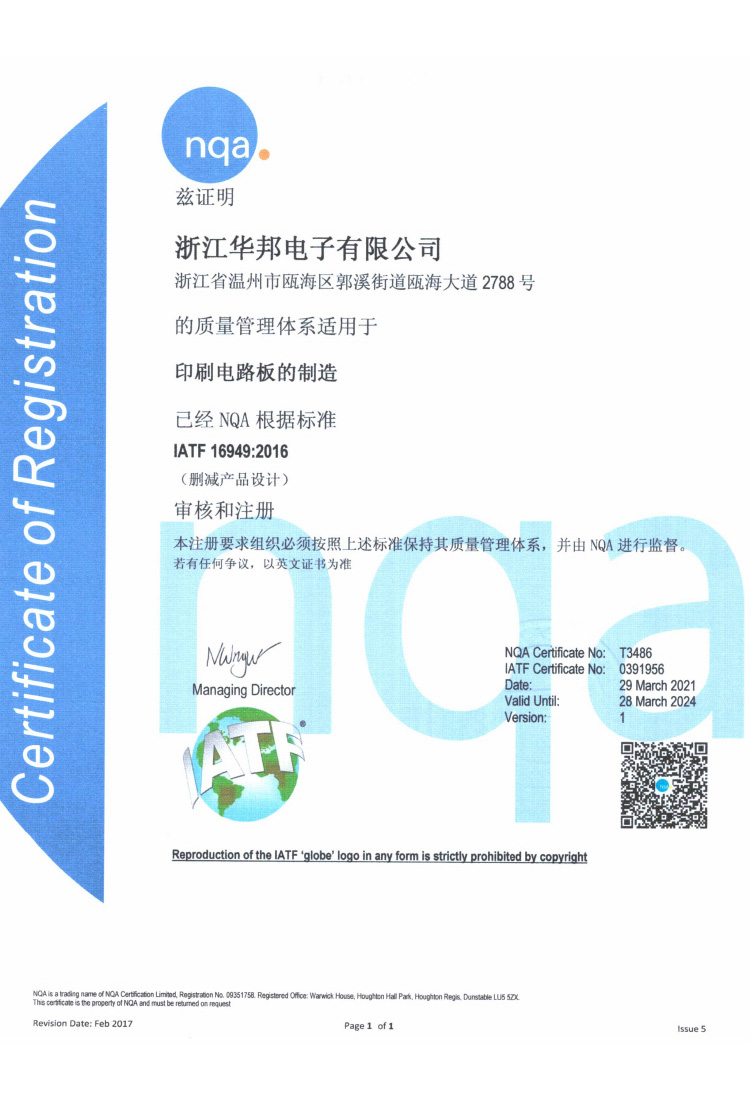浙江華邦電子有限公司位于溫州市甌海經濟開發區C園區,成立于2001年2月,是一家專門從事單、雙面及多層印制線路板的生產企業。榮獲美國UL安全認證、IATF16949證書、科技型中小企業證書、新型技術企業證書(有效期至2024年12月16日)、CQC證書等。
